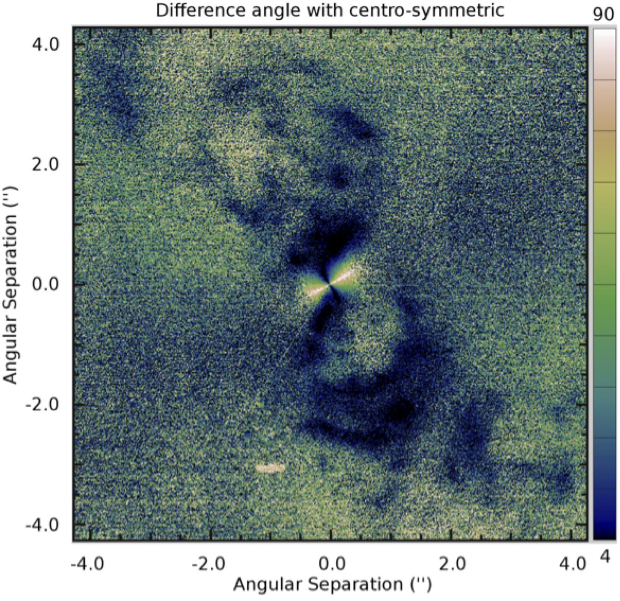 Nous avons également initié un programme d’observations de NGC 1068 avec SPHERE (Spectro-Polarimetric High contrast Exoplanet Research) [1] installé sur le télescope Yepun du VLT, exploitant ainsi les capacités polarimétriques et coronographiques de cet instrument. Ces observations par SPHERE du cœur de NGC 1068 montrent clairement une structure nucléaire compacte (20 pc × 60 pc) perpendiculaire à l’axe d’un bi-cône en forme de sablier. Elle est orientée avec un angle polaire de 118 ̊, et trace des cônes d’ionisation au nord et au sud du noyau actif. Ce serait la première observation directe du tore de poussières au cœur de NGC 1068 (Gratadour et al., 2015).
