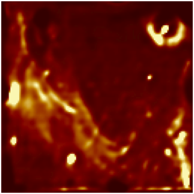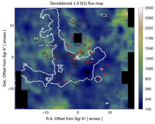Une autre question centrale pour la physique du Centre Galactique est l’origine des populations d’étoiles voisines du trou noir. En relation avec cette question, notre équipe a entrepris une étude sur le gaz moléculaire dans les parsecs centraux de la Galaxie (Ciurlo et al. 2016). Grâce à des techniques de traitement d’images héritées de la haute résolution angulaire et appliquées à des données de spectro-imagerie obtenues avec SPIFFI au VLT, nous avons montré que le gaz moléculaire H2 est présent dans tout le parsec central par une analyse simultanée de l’émission dans les différentes raies d’émission dites « ortho » et « para » de H2.