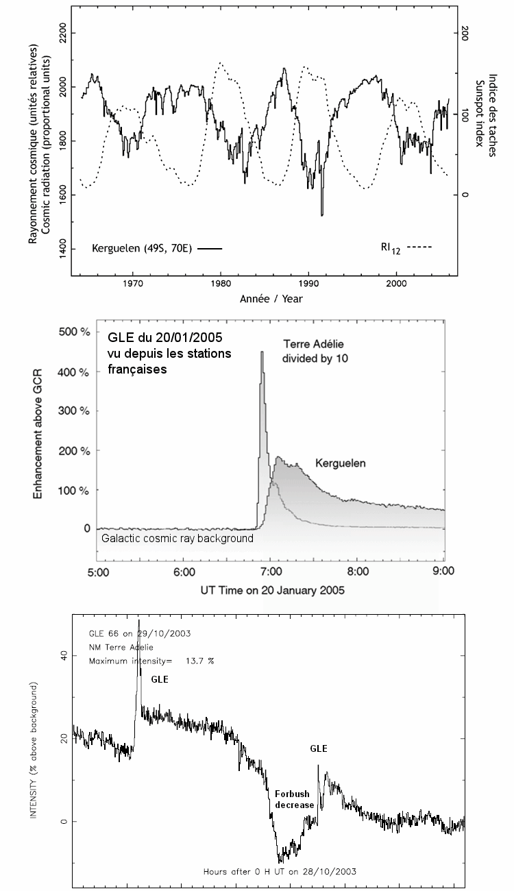 Les trois points mentionnĂ©s ci-dessus sont intimement liĂ©s. En effet si l’on mesure de manière continue le rayonnement cosmique au niveau du sol au moyen de moniteurs Ă neutrons, on constate que d’une part ce rayonnement est modulĂ© par le cycle solaire (voir figure ci-contre) et que d’autre part il peut varier de manière sporadique en fonction de l’activitĂ© Ă©ruptive du Soleil.