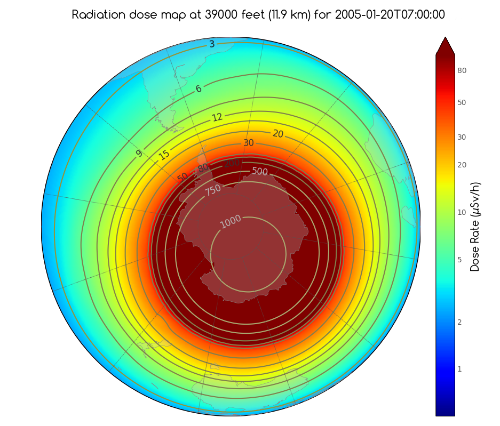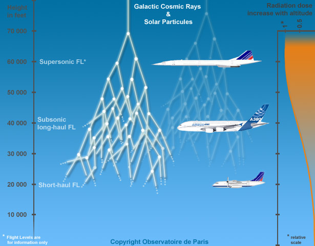 Une des consĂ©quences du rayonnement cosmique sur Terre, qu’il soit d’origine solaire ou galactique, est l’irradiation du personnel navigant. Comme on peut le voir sur la figure ci-contre, la dose de radiation augmente avec l’altitude. Les pilotes, hĂ´tesses ou stewards sont donc plus exposĂ©s aux rayonnements ionisants qu’ils ne le seraient au niveau du sol. Ces doses restent très faibles, mais depuis 2003, elles doivent lĂ©galement faire l’objet d’une surveillance. C’est le but du système SIEVERT auquel est associĂ© L’Observatoire de Paris. Grâce aux moniteurs Ă neutrons et Ă des modèles adĂ©quats, il est possible d’estimer la dose de radiation en un point de l’atmosphère donnĂ© et donc de calculer la dose reçue sur toute la durĂ©e d’un vol.