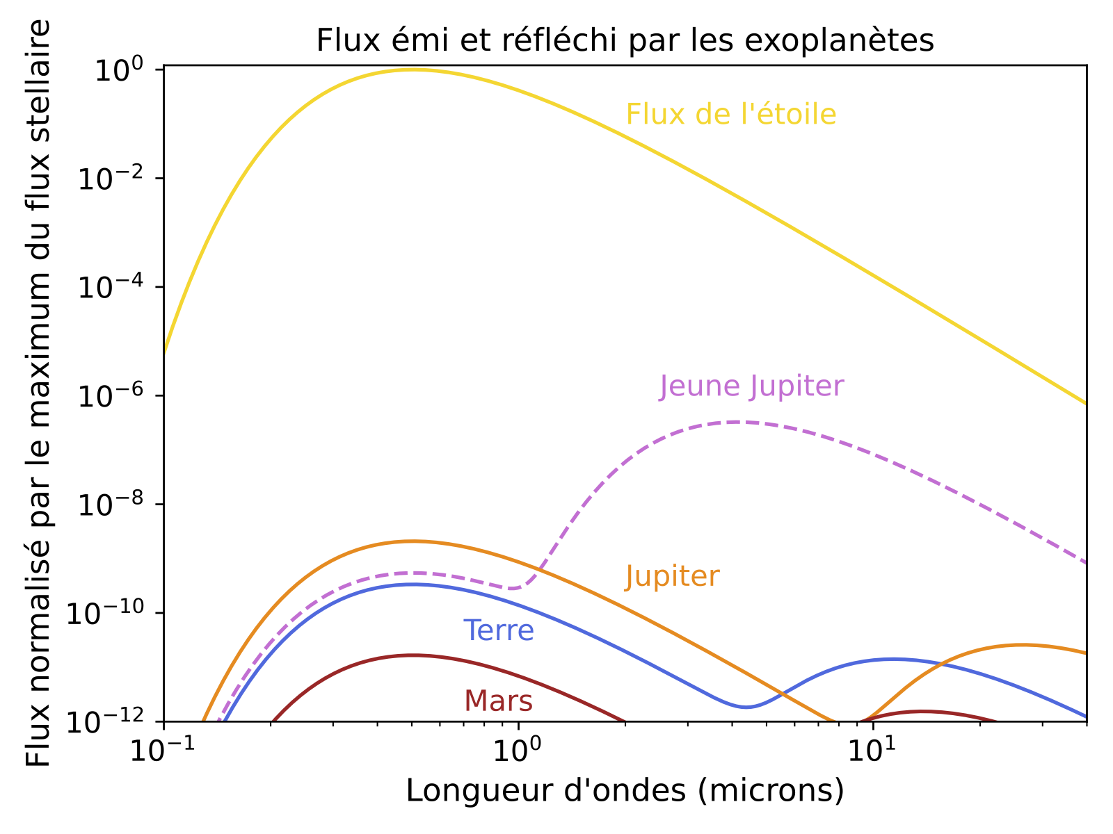 Intensité des diverses planètes du Système Solaire comparée à celle du Soleil. Le rapport de flux entre le Soleil et la Terre dans le visible est de 5 milliards. Le contraste s’améliore très nettement pour une planète chaude, comme une planète de type Jupiter quelques millions d’années seulement après sa formation.