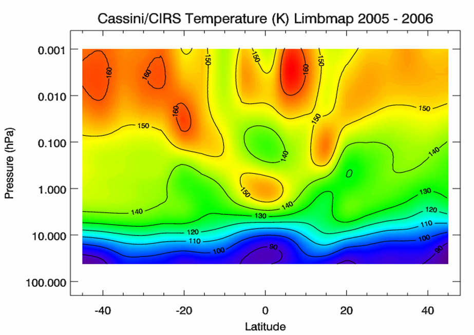 Cette carte montre la température dans l’atmosphère de Saturne en fonction de la latitude et de la pression. On voit que l’hémisphère nord, en hiver, est plus froid que l’hémisphère sud en été. Centré sur l’équateur, une oscillation de température montre que des ondes de gravité se propagent verticalement.