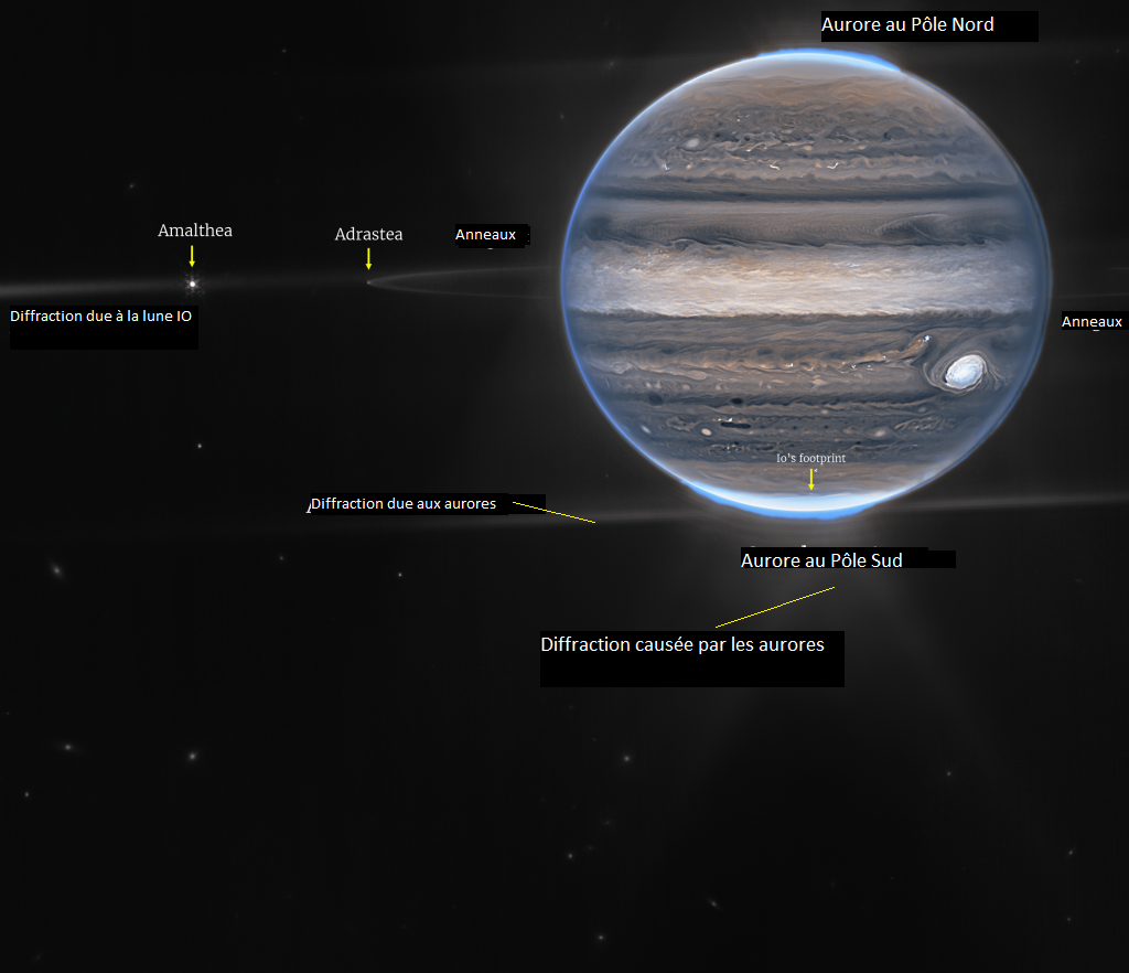 Source : NASA, ESA, CSA, Jupiter ERS Team ; traitement des images par Ricardo Hueso (UPV/EHU) et Judy Schmidt