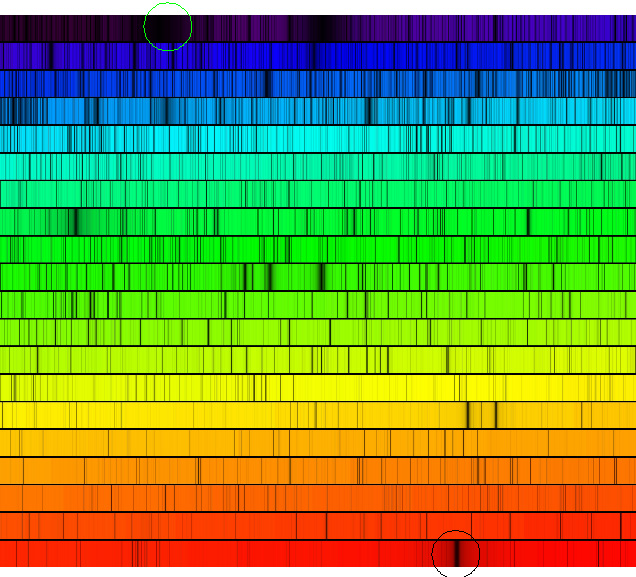 Le spectre solaire constitue l’outil de diagnostic qui permet aux astronomes d’imager les différentes couches de l’atmosphère solaire. Dans le rouge (bas à droite), la raie Hα (656.3 nm) est universellement utilisée pour la chromosphère. Dans le bleu (en haut à gauche), la raie K de CaII 393.4 nm fournit une autre vision de la chromosphère. Il y a des milliers de raies disponibles, chacune caractéristique d’une transition entre 2 niveaux d’un atome particulier.