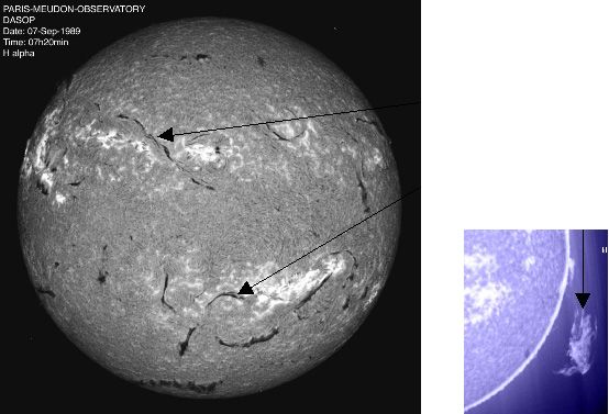 Les filaments (qui apparaissent en protubérances au bord solaire) sont constitués de matière dense de type chromosphérique (8000 degrés) en suspension dans la couronne 100 fois plus chaude sous l’influence de champs magnétiques qui les soutiennent contre la gravité.