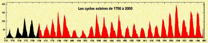 Les astronomes observant les taches ont constatĂ© rapidement le caractère cyclique de la surface tachĂ©e en fonction du temps : le nombre de taches Ă©volue avec un cycle moyen de 11 ans, comme le montre la figure ci dessous, correspondant en rĂ©alitĂ© Ă une cyclicitĂ© magnĂ©tique de 22 ans (la polaritĂ© magnĂ©tique des deux hĂ©misphères Nord et Sud du Soleil se renversant tous les 11 ans). L’intensitĂ© des cycles est variable : il y a des cycles forts (plus de taches) et des cycles faibles. On soupçonne une seconde pĂ©riode voisine de 80 ans dans la modulation des cycles. Le passĂ© a connu des cycles très peu actifs, comme le Minimum de Maunder au temps de Louis XIV, corrĂ©lĂ© Ă une pĂ©riode climatique froide dite de « petit âge glaciaire ». Mais pour le moment, l’influence rĂ©elle des cycles solaires sur le climat terrestre reste Ă dĂ©terminer et constitue un sujet de recherches dĂ©battu.