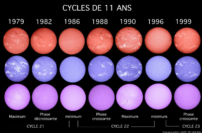 cycles solaires (période 1979 – 1999) observés dans 3 domaines spectraux différents de la chromosphère (deux rangées du haut) et de la photosphère (rangée du bas) – couleurs artificielles - Noter l’absence de structures sur la surface aux minima solaires (1986 et 1996)