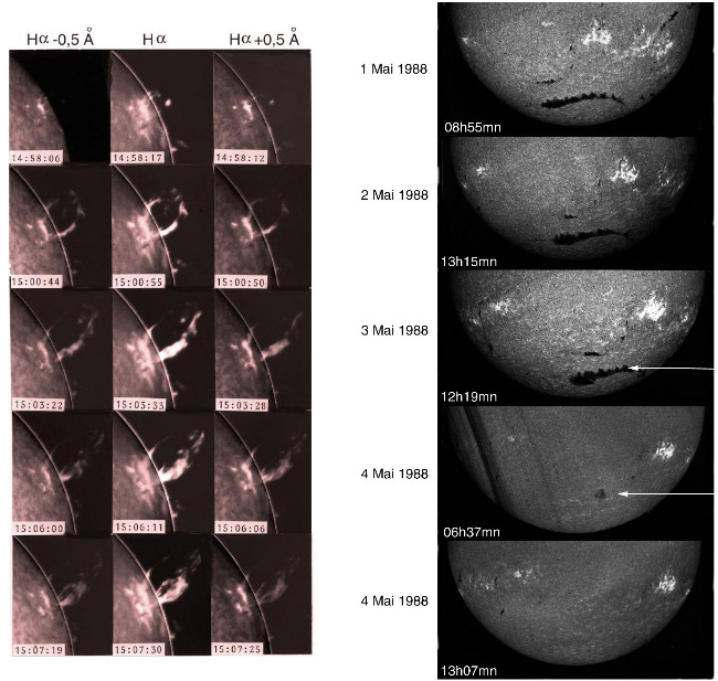 Le Soleil est dynamique et évolue en permanence : à gauche une éruption qui se développe en quelques minutes ; à droite la déstabilisation d’un filament, plus lente, s’étale sur quelques heures.