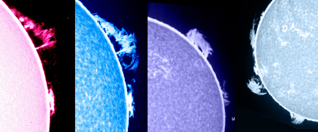 Les protubérances au dessus de la chromosphère peuvent atteindre 100 000 km de hauteur et se déstabiliser, provoquant une éjection de masse coronale pouvant se diriger vers la Terre (couleurs artificielles)
