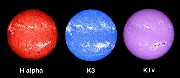 Trois visions de l’atmosphère solaire : à gauche, la chromosphère et ses filaments dans la raie Hα de l’Hydrogène. Au centre, d’autres structures chromosphériques comme les facules apparaîssent au cœur de la raie K du CaII. Et à droite, c’est la photosphère et ses taches dans l’aile de la raie K du CaII (les couleurs sont artificielles).