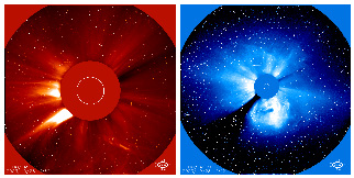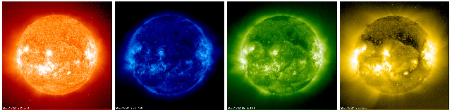 En UltraViolet, domaine réservé aux instruments en orbite, la basse couronne apparaît dans des températures de 80 000 à plus de 2 millions de degrés (EIT/SOHO, couleurs artificielles)