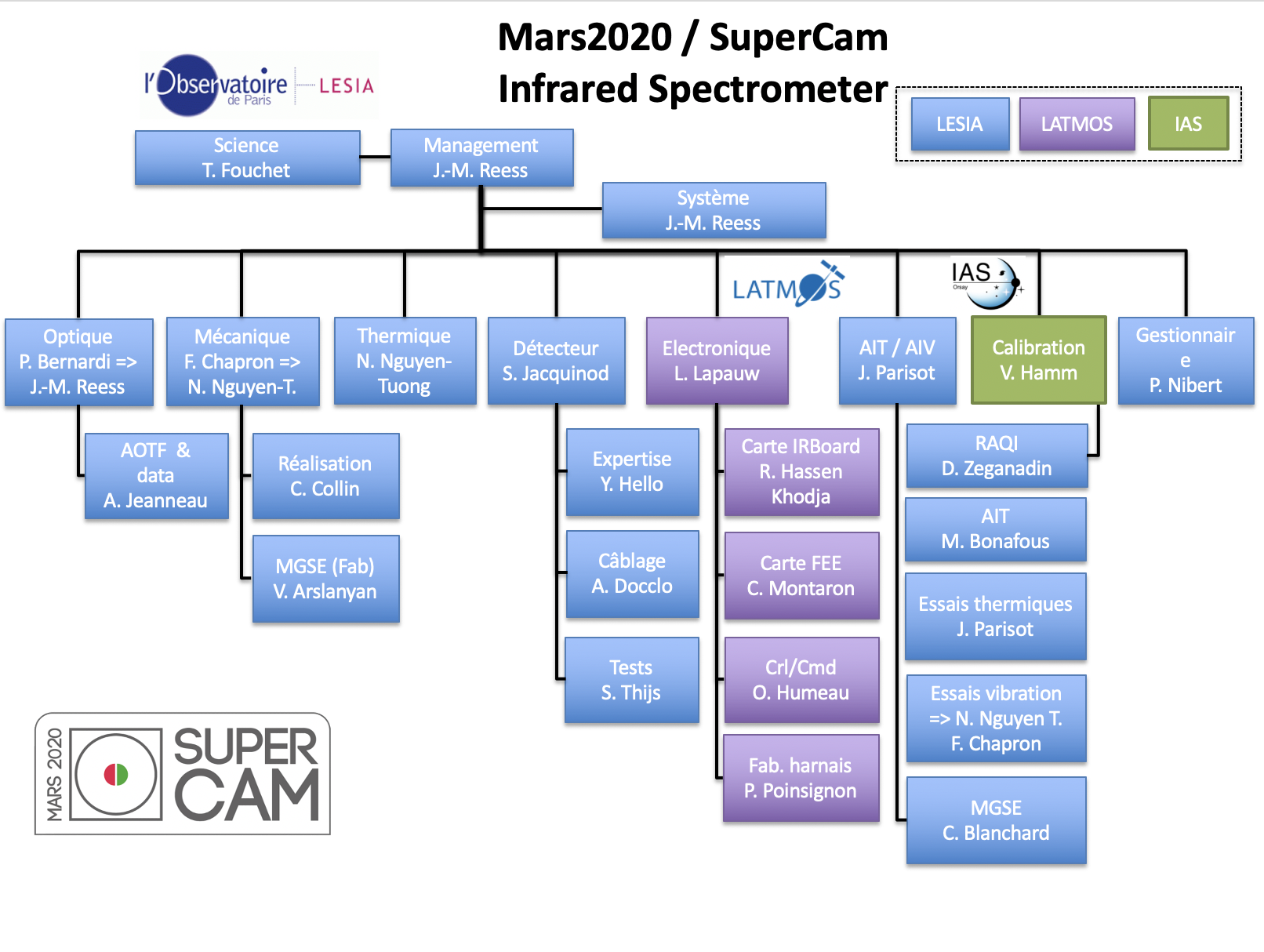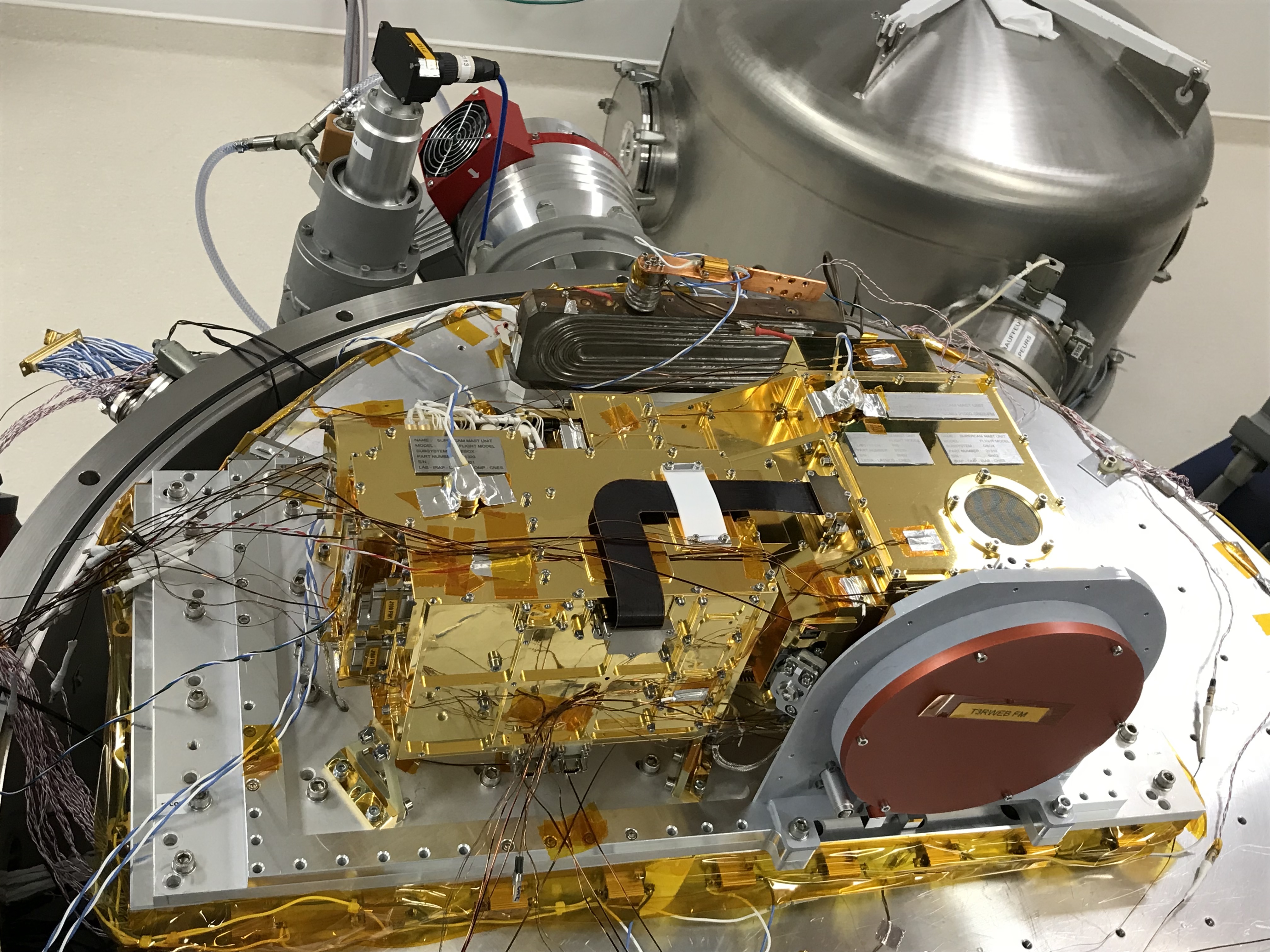 Le spectromètre infrarouge modèle EQM a Ă©tĂ© livrĂ© Ă l’Ă©tĂ© 2017 pour intĂ©gration et tests dans le Mast Unit EQM. En FĂ©vrier 2018, le Mast Unit EQM est revenu au LESIA pour la calibration de l’ensemble de la voie infrarouge puis a Ă©tĂ© livrĂ© au Los Alamos National Laboratory pour couplage avec le Body Unit. Les premiers spectres sur Ă©chantillons de roches ont Ă©tĂ© obtenus avec des performances de l’ensemble très encourageantes. Les intĂ©grations de modèle de vol ont suivi et l’instrument a Ă©tĂ© livrĂ© Ă l’IRAP en Mars 2019. Comme pour l’EQM le modèle de vol Mast Unit est revenu Ă Meudon en Mai 2019 pour la calibration de la voie infrarouge dans les nouvelles installations du CTS. L’ensemble de l’instrument SuperCam a Ă©tĂ© livrĂ© au JPL pour intĂ©gration sur le rover Perseverance et sera lancĂ© en direction de Mars en Juillet 2020.