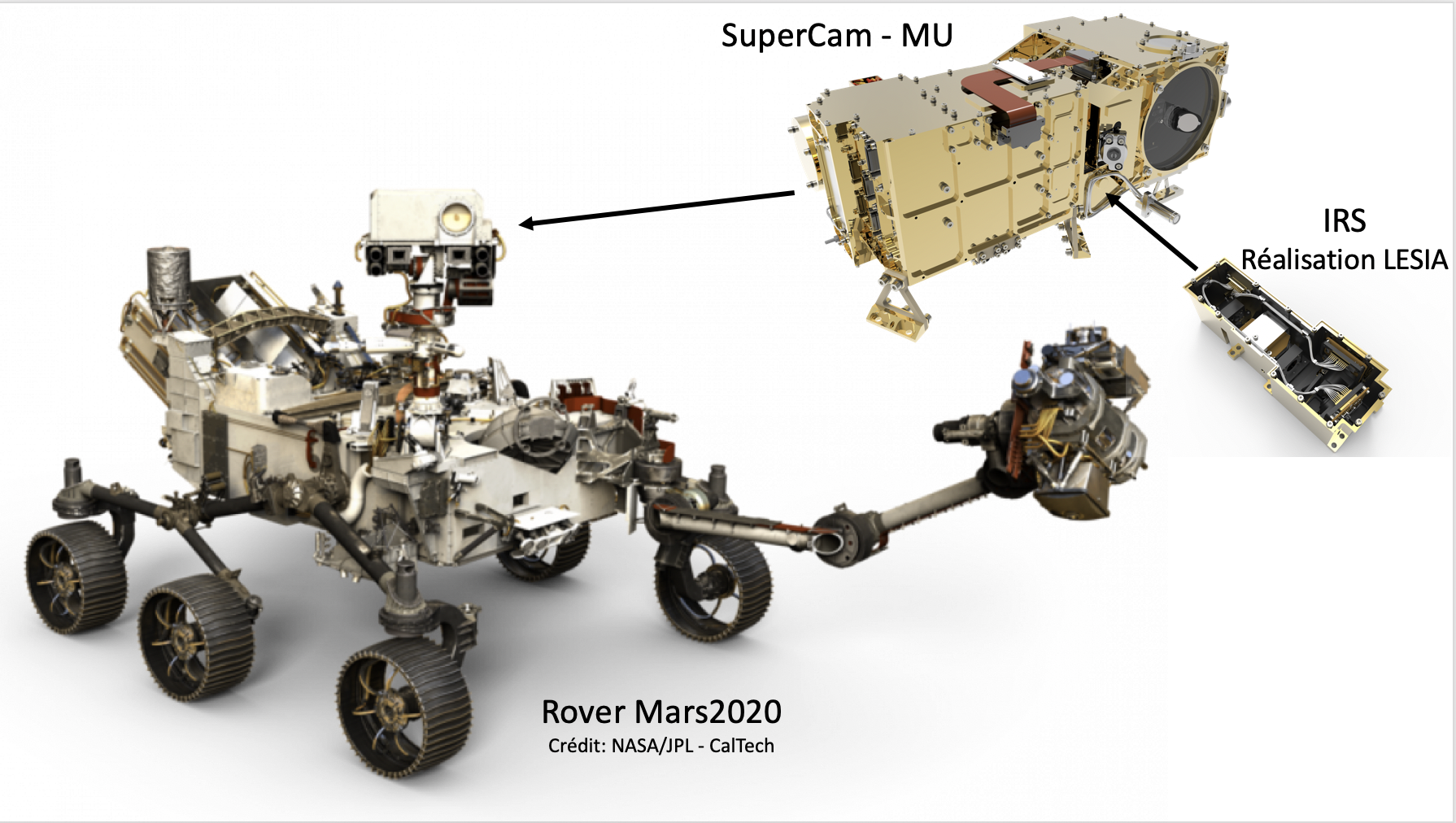 Parmi les 7 instruments scientifiques de la mission Mars2020 se trouve l’instrument SuperCam dĂ©veloppĂ© conjointement par un ensemble de laboratoires (IRAP, LESIA, LATMOS, LAB, IAS, ISAE), universitĂ©s et industriels français et amĂ©ricains (LANL). Il pourra mesurer la composition chimique des roches en tirant dessus au laser (technique LIBS) et en fera une image couleur cette fois. SuperCam pourra dĂ©tecter les minĂ©raux et la matière organique par spectroscopie Raman et infrarouge (IR). Les diffĂ©rentes techniques fonctionnent Ă distance : jusqu’Ă 7 m pour le LIBS, 12 m pour le Raman, et jusqu’à l’horizon pour la spectroscopie IR et l’imagerie. Le Raman repose sur un faisceau pulsĂ© Ă 532 nm et la diffusion inĂ©lastique d’un photon Ă plus grande longueur d’onde (Ă©mission Stokes). La spectroscopie IR couvre la bande spectrale 1.3 µm – 2.6 µm.