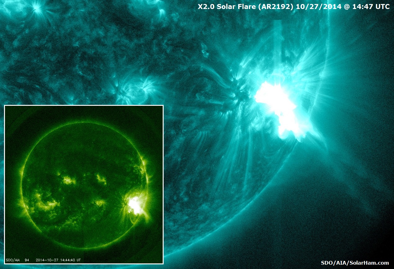 Éruption solaire vue par l’imageur Atmospheric Imaging Assembly (AIA) à bord de la mission américaine SDO. À gauche, une vue d’ensemble du Soleil (94 A), et à droite un zoom sur l’éruption (131 A).