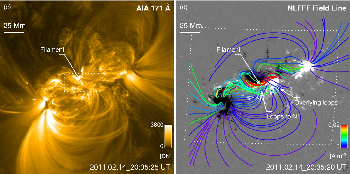Une région active le 14 février 2011 – 20:35:25 UT, vue dans l’UV avec l’instrument SDO/AIA 171Å (gauche) et le magnétogramme à la surface correspondant, obtenu par l’instrument SDO/HMI (droite – niveau de gris). Le champ magnétique coronal est ensuite reconstruit en 3D à partir de ce magnétogramme 2D, et indiqué par les lignes colorées.