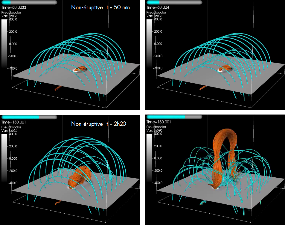 Au total, ce sont 7 simulations numériques qui ont été testées dans ce travail, dont 3 simulations conduisant à la formation de régions actives stables, i.e. non-éruptives et 4 formant des éruptions. Deux de ces simulations sont représentées en 3D sur la figure 3, dont une simulation non-éruptive (droite) et une simulation non-éruptive (gauche). L’éruption est déclenchée en fonction d’un seul paramètre, l’orientation du champ magnétique coronal initial. Pour déterminer le potentiel prédictif des paramètres testés, il faut évidemment comparer aux régions actives pour lesquelles il ne se produit pas d’éruption. Pour qu’un paramètre physique mesuré à la surface solaire soit considéré comme un bon indicateur du déclenchement d’une éruption, il faut donc qu’il présente les caractéristiques suivantes :