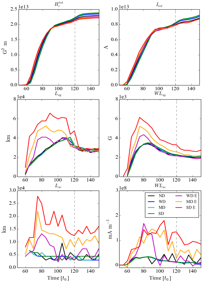 Évolution de 6 des 99 paramètres testés. Les simulations non-éruptive (respectivement non-éruptives) correspondent aux couleurs froides (respectivement chaudes). L’éruption, si elle a lieu, se déclenche à environ t = 120 t0, soit environ 2h après le début de l’émergence, et est indiquée par la ligne verticale en pointillé grise. Haut : l’hélicité de courant, et le courant total mesuré. Ces deux paramètres montrent le même comportement quelque soit le type de simulation ; ils ne peuvent donc pas être utilisé pour de la prévision. Milieu/ Bas : 4 des 6 paramètres liés à la ligne d’inversion magnétique, qui présentent des signatures pré-éruptives, i.e. des valeurs plus grandes avant l’éruption.