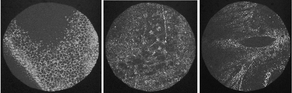Des images de rétines explantées de rat, entre lame et lamelle, ont été obtenues sur le banc d’OCT plein champ seule. Après acquisition d’une pile d’images en-face (en XY), n’importe quelle coupe axiale (XZ ou YZ) peut être extraite des données.