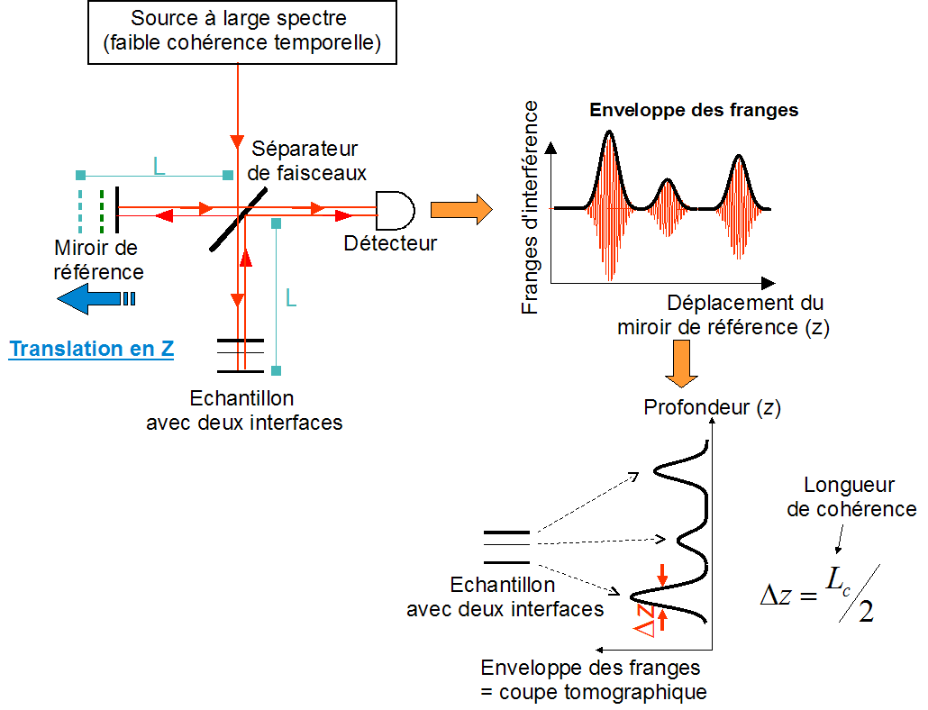 L’enveloppe des franges d’interférence (entre une référence et l’échantillon) donne directement l’image des structures de l’échantillon et permet de les localiser en profondeur, à la demi-longueur de cohérence de la source près.