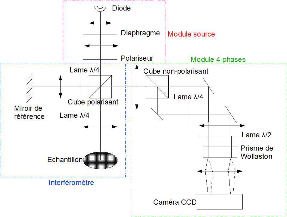 Classiquement, le moyen le plus simple est d’acquérir ces 4 images temporellement l’une après l’autre, en modulant la position du miroir de référence. Cependant, à cause des mouvements rapides de l’oeil, il faut dans le cadre du projet OEIL acquérir simultanément ces 4 images. La nouveauté de l’instrument développé au LESIA est l’utilisation de la polarisation de la lumière pour créer en sortie de l’interféromètre 4 faisceaux déphasés de π/2 simultanément détectés par la caméra CCD. Un des composants optiques utilisés est un prisme de Wollaston qui a la faculté, dans une configuration précise, de créer, à partir d’un faisceau d’entrée, deux faisceaux déviés verticalement et déphasés de π. Un cube séparateur de faisceaux et une lame quart d’onde complètent entre autres le montage pour fournir les 4 faisceaux déphasés de π/2.