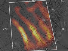 La figure superpose une image visible et une image infrarouge CIRS. Les zones brillantes dans l’infrarouge sont chaudes et correspondent Ă des fractures Ă la surface par lesquelles le gaz s’Ă©chappe en geysers