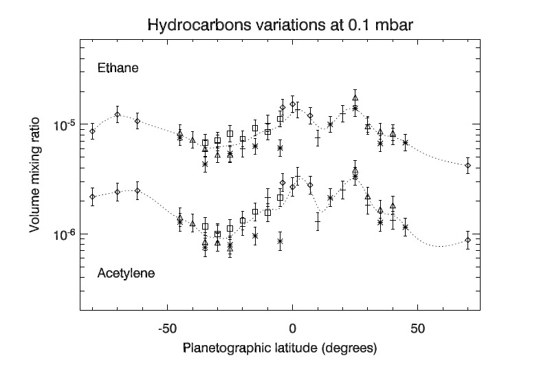 Variation en latitude de l’abondance de l’éthane et de l’acĂ©tylène sur Saturne. Le maximum Ă 30°N est dĂ» Ă la circulation atmosphĂ©rique.
