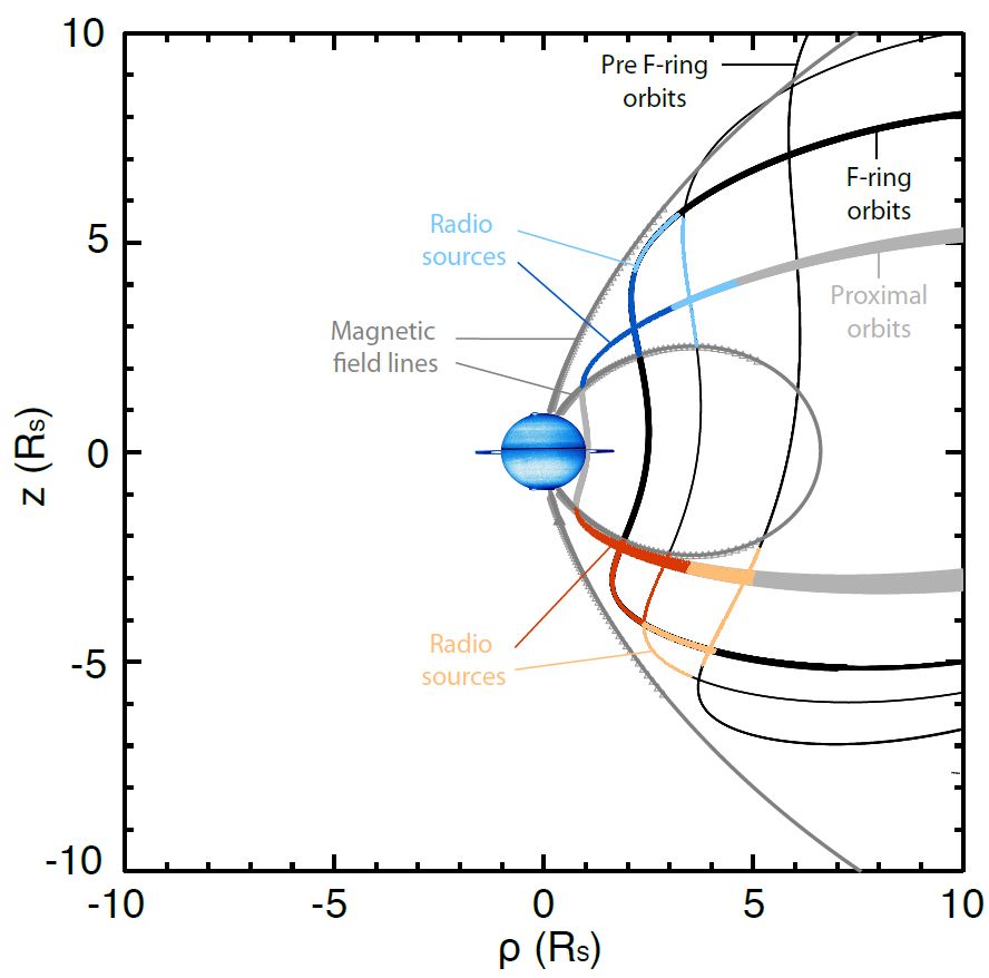 Le « Grand finale » correspond à des orbites polaires courtes (en couleur). Dans cette étude, les auteurs ont étudié les 20 orbites dont le périkrone était situé juste au-delà de l’anneau F (en jaune, « F-ring ») ainsi que les 7 orbites d’approche (« pre F-ring ») qui les ont précédés.