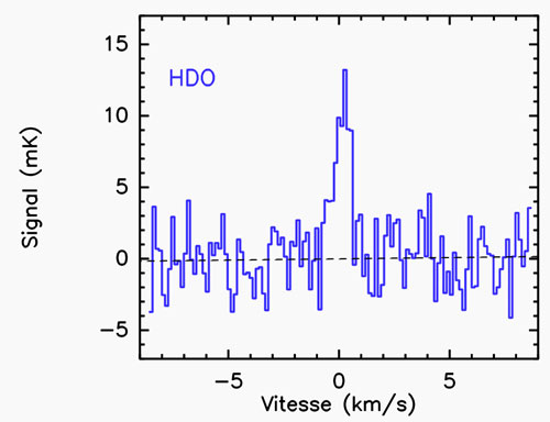 Signature (spectre) de l’eau mi-lourde HDO, forme particulière de l’eau, détectées dans la comète Hartley 2, le 17 novembre 2010, à environ 0,59 mm de longueur d’onde (509,292 GHz de fréquence) avec l’instrument HIFI de l’observatoire spatial Herschel.