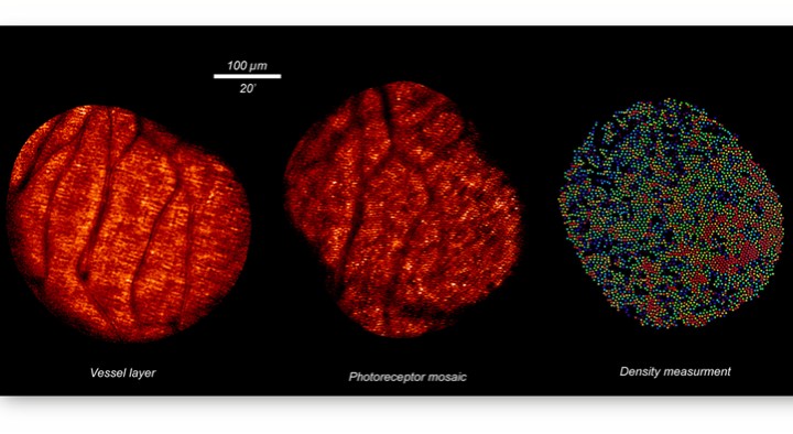 Cette image montre le résultat de deux reconstructions grand champ. A gauche, une image grand champ de capillaires de diamètres compris entre 5 et 10 microns. On résout la paroi des vaisseaux sur ces images. Au centre, image grand champ de photorécepteurs sur laquelle on peut commencer à voir varier leur diamètre en fonction de l’excentricité (fovéola en bas à droite de l’image). A droite, image grand champ en fausses couleurs permettant de visualiser le nombre de proches voisins pour chaque cône (plus la couleur est chaude, plus le nombre de voisins est élevé).