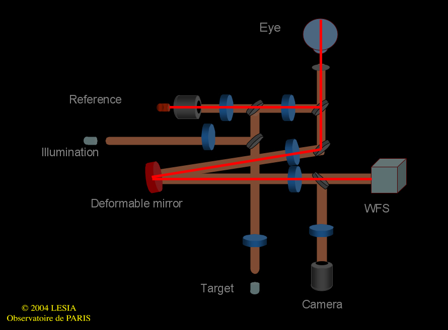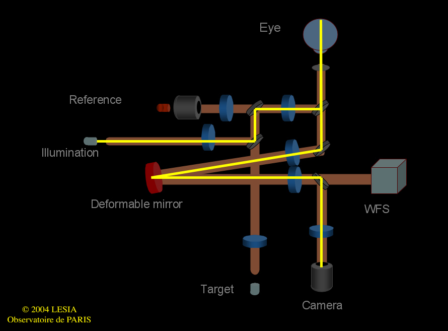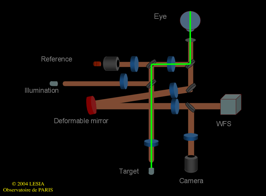 Cet instrument, le premier réalisé dans le cadre des activités ŒIL au LESIA, a atteint un niveau de robustesse permettant le passage systématique de sujets et de patients. Il a été transféré au CIC des Quinze-Vingts, dans le service du professeur Sahel début 2005. L’examen de fond d’œil par OA a fait partie intégrante d’un protocole clinique (40 yeux sains, 200 présentant des pathologies maculaires variées) associant :