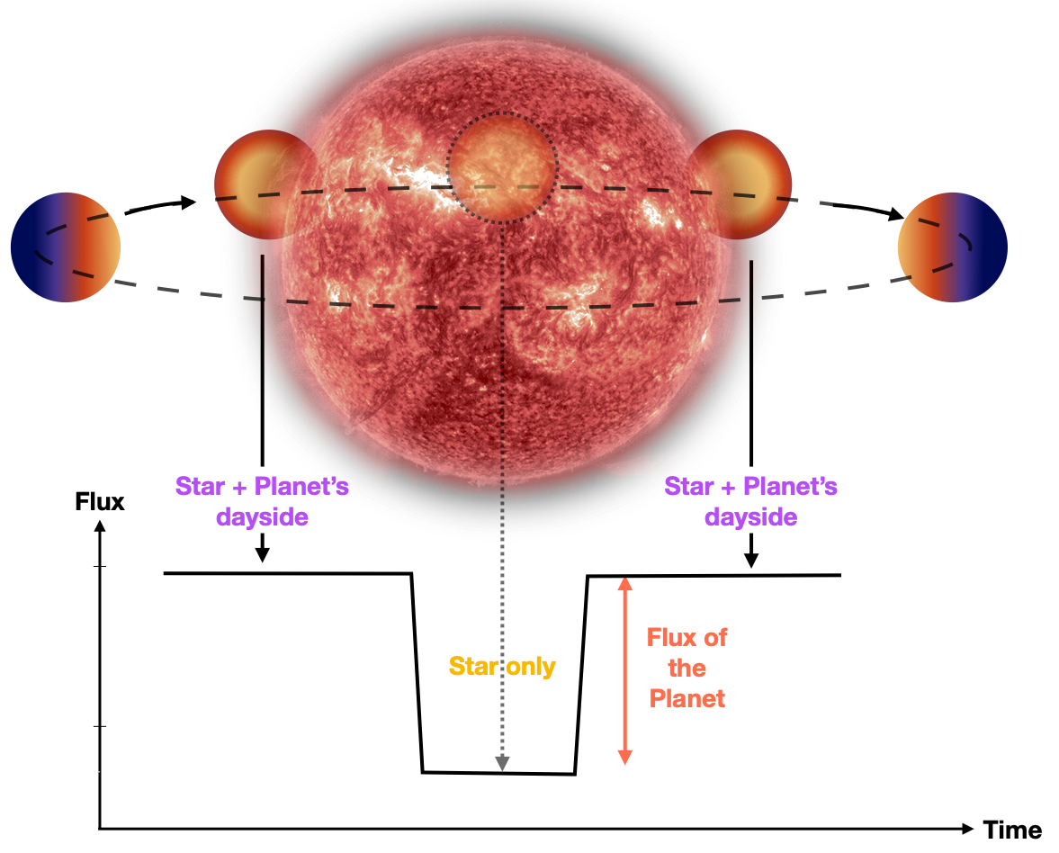 Une solution pour surmonter cette contamination stellaire et obtenir des informations sur la présence (ou l’absence) d’une atmosphère, est de mesurer directement la chaleur de la planète en observant une baisse du flux lorsque la planète passe derrière l’étoile (un événement appelé occultation). En observant l’étoile juste avant et pendant l’occultation, on peut déduire la quantité de lumière infrarouge provenant de la planète (voir Figure 1).