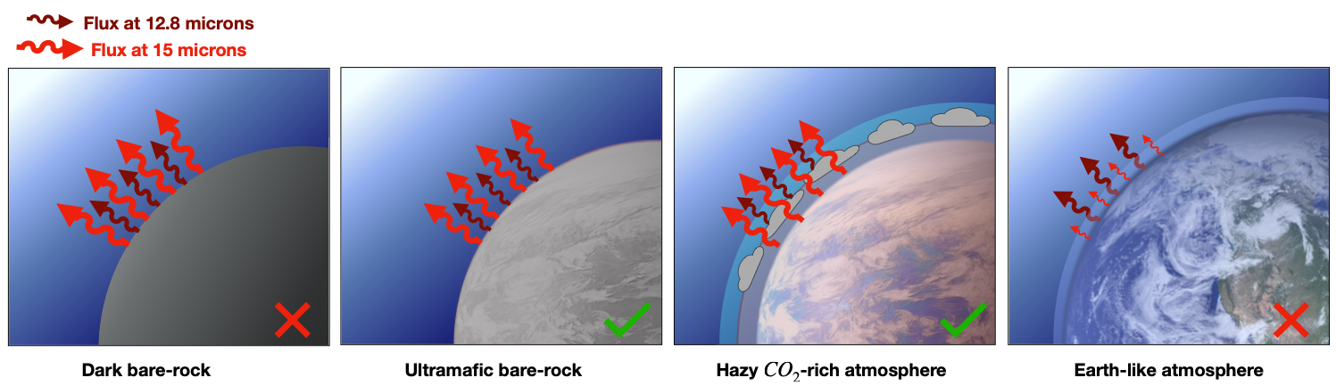 Mais ces conclusions sont nuancées par une équipe internationale qui publie le 16 décembre 2024 dans Nature Astronomy une analyse complète de toutes les données infrarouges collectées sur TRAPPIST-1 b. Dans cette nouvelle étude menée par Elsa Ducrot, alors postdoctorante à l’Observatoire de Paris-PSL (et actuellement astronome au CEA), les auteurs ont mesuré le flux de la planète à une autre longueur d’onde : 12,8 microns. Ils ont effectué une analyse globale de toutes les données disponibles du JWST et ont comparé ces observations avec des modèles de surfaces et d’atmosphères afin d’identifier le scénario correspondant le mieux aux données.