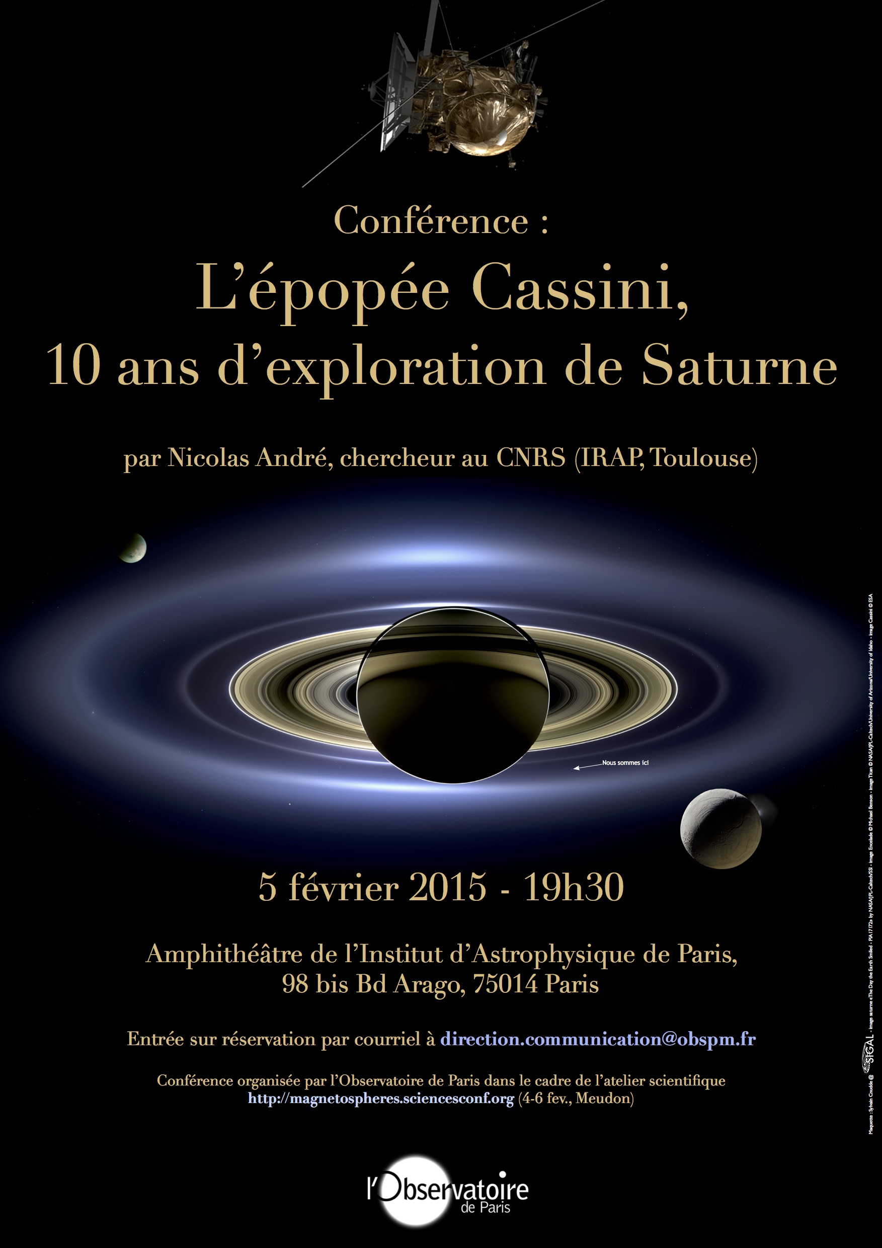 Le jeudi 5 février 2015 à 19h00, en parallèle de l’atelier sur les magnétosphères comparées, se tiendra une conférence grand public sur le thème : "L’épopée Cassini, 10 ans d’exploration du système de Saturne". Elle sera donnée par Nicolas André, chercheur au CNRS (IRAP, Toulouse).