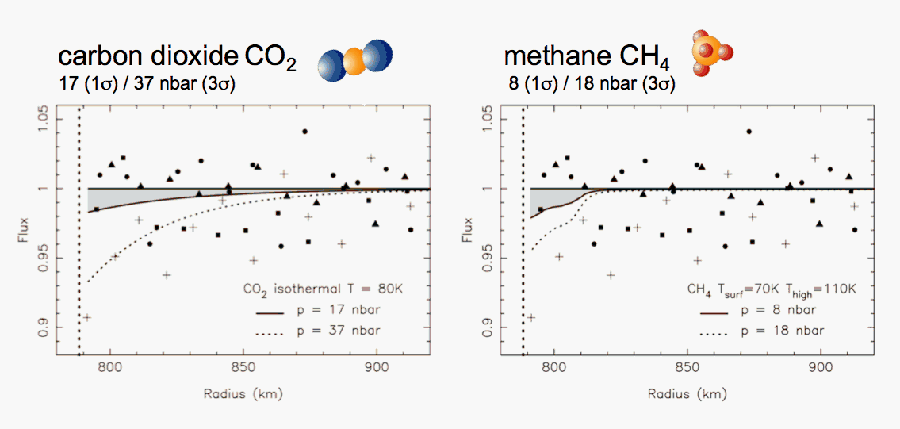 Ces valeurs, très faibles, démontrent la capacité de la méthode d’occultations pour contraindre la pression de surface d’un objet lointain à des niveaux mille fois inférieurs aux pressions actuellement mesurées sur Triton et Pluton. Cette précision est très prometteuse pour la recherche d’une éventuelle atmosphère autour d’un gros objet transneptunien (OTN), tels Eris, Makemake ou Quaoar, distants de 40 à 70 UA [3] : à la surface de ces objets on a identifié des glaces volatiles, qui pourraient sublimer lorsque le corps se trouve dans la partie de son orbite la plus proche du soleil. Or à cette distance les glaces sont pratiquement stables à l’échelle de l’âge du système solaire, et constituent un réservoir important pour la constitution d’une atmosphère.