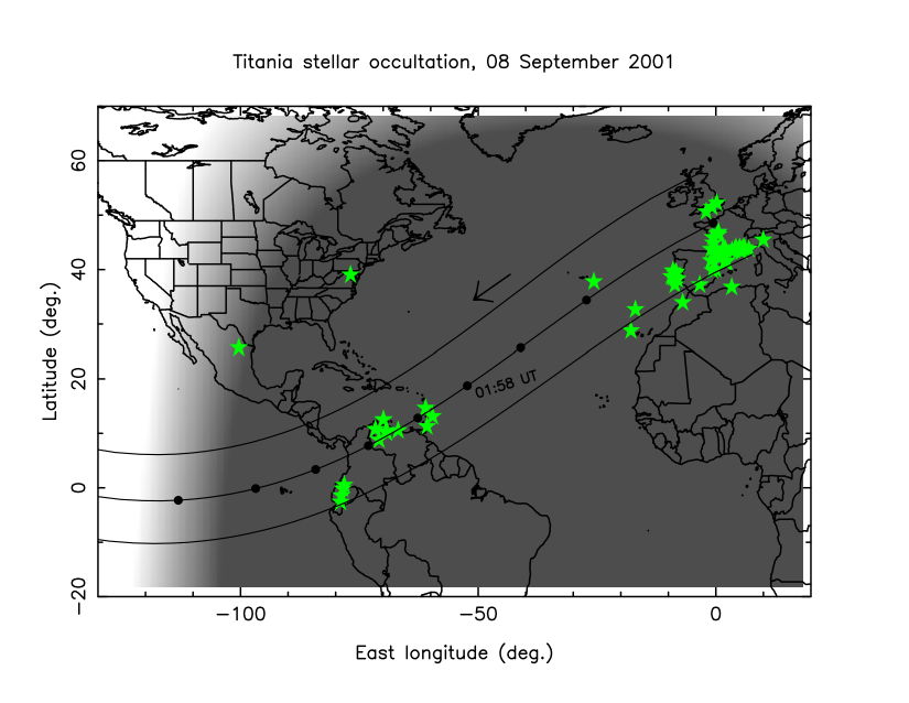 Trajectoire de l’ombre de Titania sur Terre le 8 septembre 2001. Les étoiles indiquent la position géographique des stations ayant observé l’occultation stellaire sur trois continents, parmi lesquelles des observations visuelles conduites par des amateurs. (cliquer sur l’image pour l’agrandir)