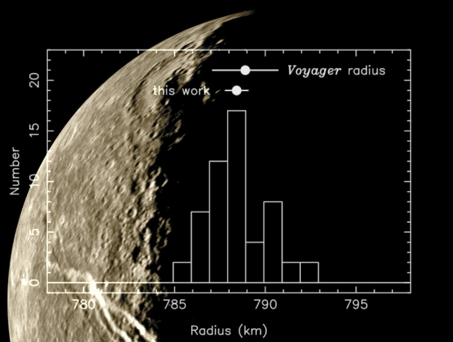 Les différentes cordes d’occultation ont permis de déterminer le rayon de Titania, 788.4 ± 0.6 km, améliorant la valeur obtenue lors de la mission Voyager, 788.9 ± 1.8 km. La précision est limitée non par l’incertitude de mesure, mais par la topographie du satellite, qui montre des failles et des escarpements de l’ordre du kilomètre, conduisant à cet histogramme des valeurs obtenues par 27 stations. Titania se trouvait alors à 2,85 milliards de kilomètres de la Terre. En arrière-plan : Image de Titania obtenue à partir de Voyager-II en 1986. (cliquer sur l’image pour l’agrandir)