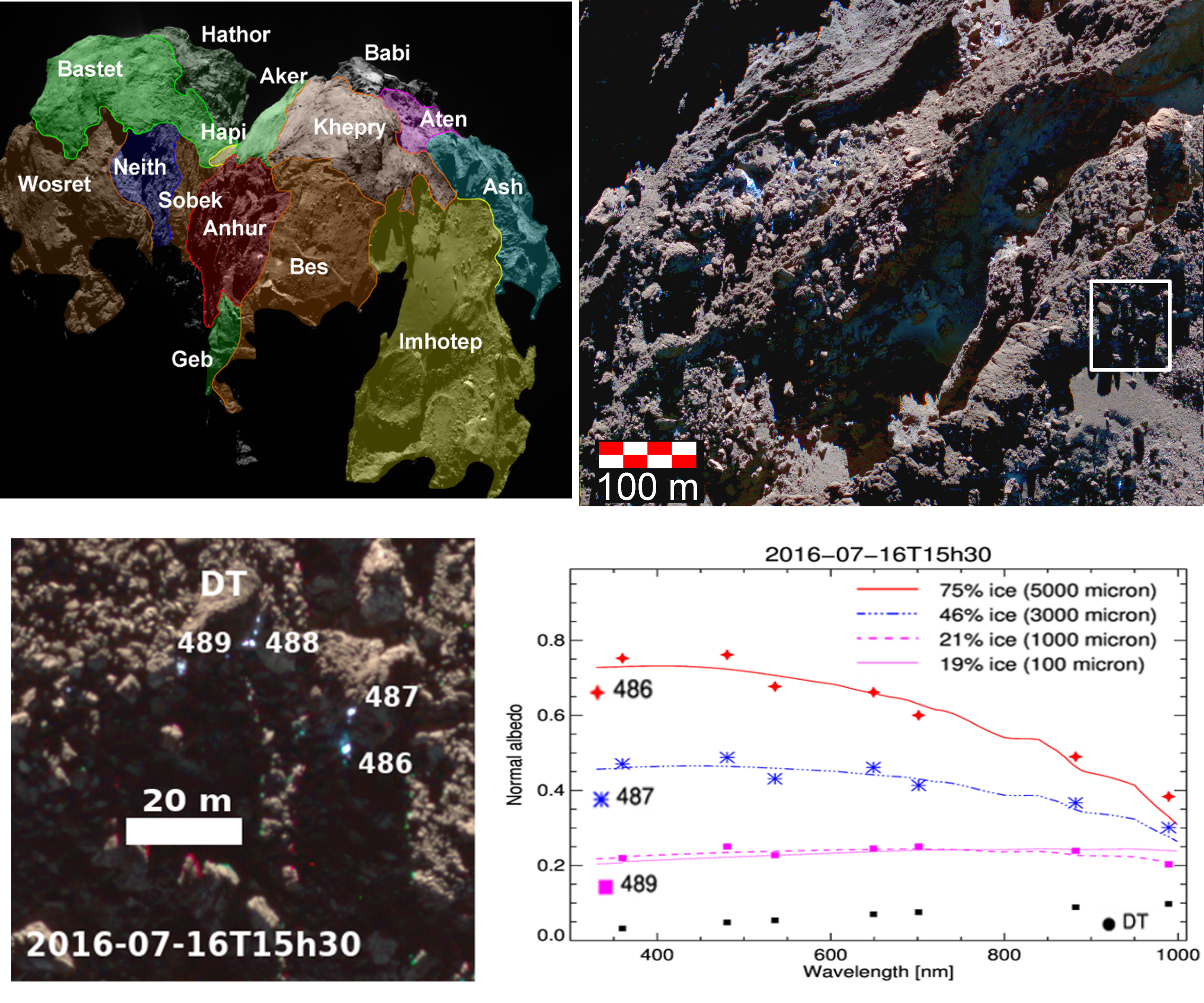 Image de la comète 67P avec en superposition les contours et le nom de certaines régions d’intérêt (en haut à gauche). En haut à droite : image en couleurs et en haute résolution (30 cm/pixel) prise le 25 juin 2016 d’une partie de la région d’Anhur, celle qui présente le plus grand nombre de taches brillantes. En bas à gauche, nous montrons la modélisation spectrale des points brillants numérotés 489, 487, et 486. Le rectangle blanc en bas à droite indique la surface où des petites taches brillantes (surface < 1 mètre carré) très riches en glace d’eau ont été observées, et bien visible sur l’image en bas à gauche, prise le 16 juillet 2016. Les numéros se réfèrent à l’ordre des régions exposant la glace d’eau répertoriés dans le catalogue.