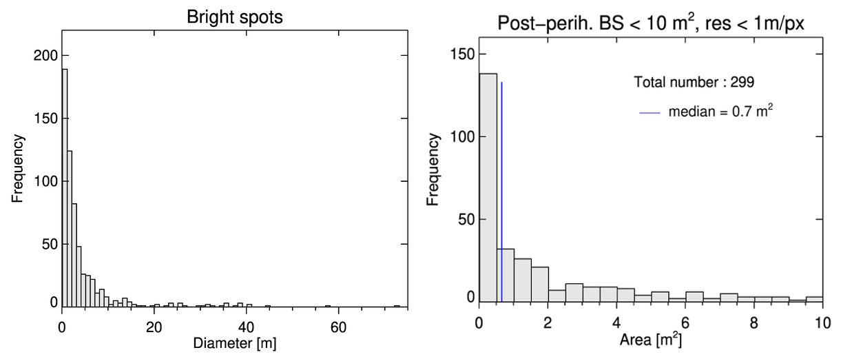 À gauche : Fréquence des zones exposant de la glace d’eau (Bright spots ou BS) en fonction de leur taille (diamètre). On voit clairement que la plupart de ces régions a une taille inférieure à quelques mètres. À droite : fréquence des zones exposant de la glace d’eau (BS) en fonction de leur surface observées après le passage du périhélie et avec une résolution spatiale < 1m/pixel.