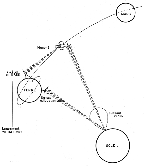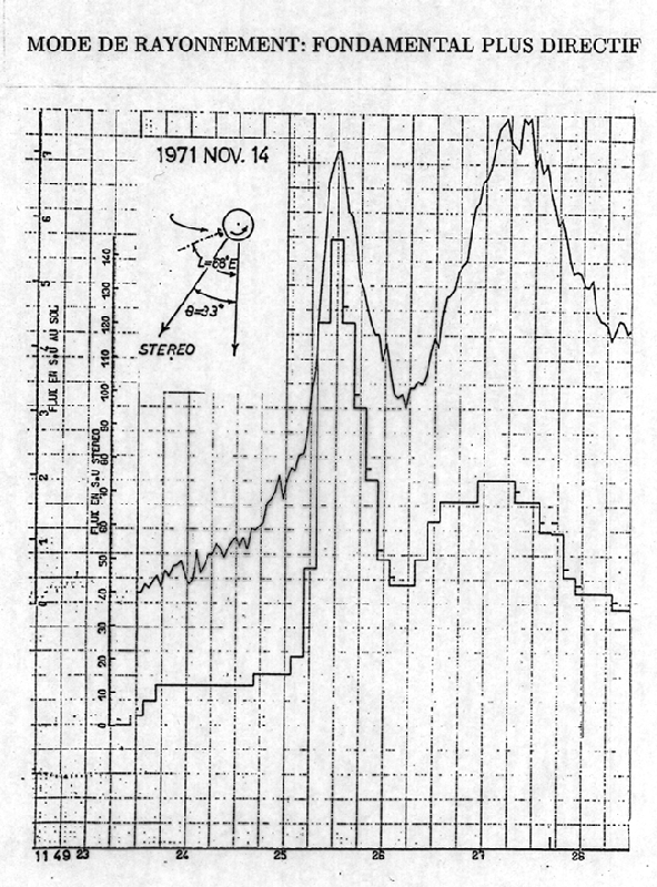Enregistrement d’un sursaut solaire depuis la Terre et depuis la sonde Mars-3 qui est dans une direction formant un angle de 33 degrés avec celle de la Terre (données de Mars-3 tracées en échelons). Ces deux enregistrements sont très différents, ce qui montre que le signal reçu dépend de la direction d’observation.