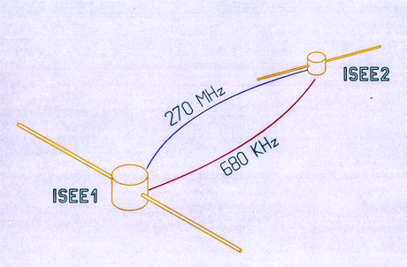 Entre ISEE-1 et -2, nous propagerons des ondes de fréquences très différentes : celle de plus haute fréquence sera très peu affectée par le milieu, l’autre, de fréquence bien plus basse, le sera beaucoup plus. On comparera les deux temps de propagation pour en tirer la densité du milieu.