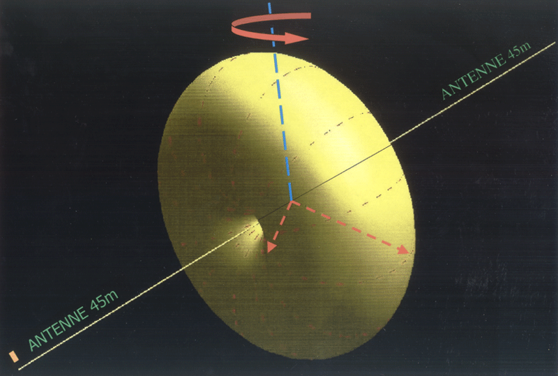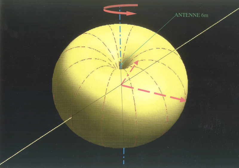 Un dipôle est insensible au rayonnement d’une source étroite placée dans la direction des brins ; mais il est sensible à celui d’une source située dans un plan perpendiculaire aux brins. Quand le dipôle tourne dans ce plan, le signal reçu d’une source proche de ce plan est maximum quand cette source est vue dans une direction perpendiculaire au dipôle, mais très faible quand la source est dans l’axe des brins. Cette variation de la sensibilité de l’antenne en fonction de la direction de la source est représentée par le tore jaune. Au cours de la rotation, on peut ainsi mesurer la direction d’une source dans le plan de rotation de l’antenne.
