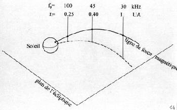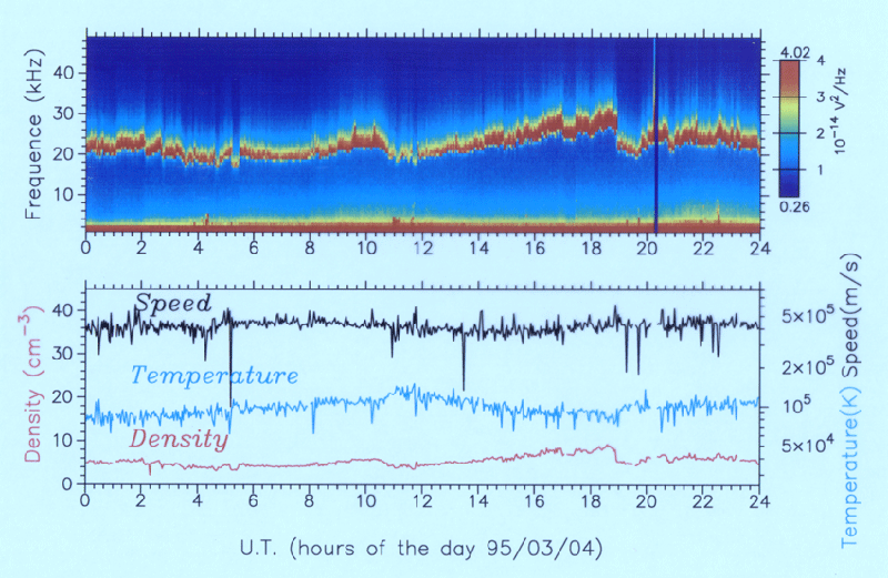 Rappelez-vous que les expériences faites avec les fusées EIDI avaient montré que les antennes n’étaient pas seulement sensibles aux ondes de radio mais à d’autres ondes : des ondes électrostatiques. Ces ondes sont dues au mouvement des électrons ; ces mouvements aléatoires définissent la température du milieu. Le signal dû à ces mouvements est donc d’origine thermique. Le signal du spectre thermique est faible et il n’a pu être exploité au laboratoire que grâce à des récepteurs parfaitement conçus puis constamment perfectionnés depuis ISEE-3 jusqu’à Ulysse et à Wind.