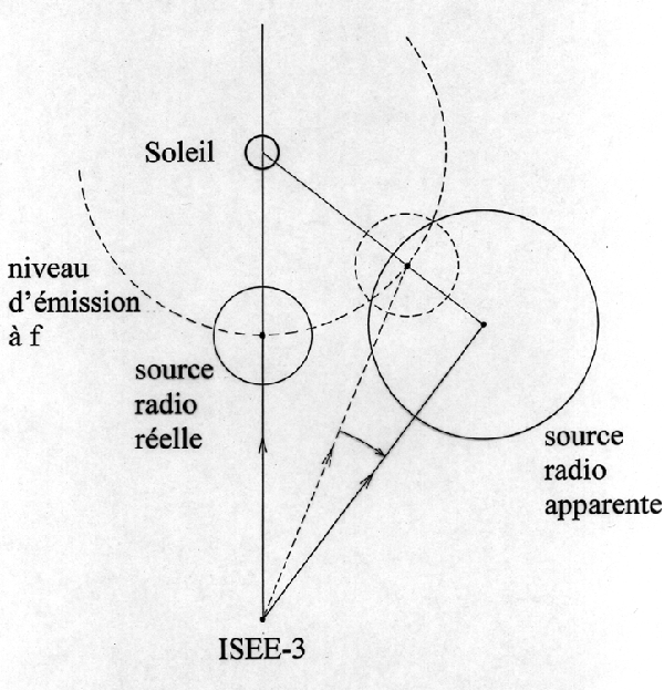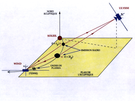 Wind est capable de fournir une direction complète à deux dimensions. Quand on dispose, en plus, de mesures de direction obtenues à Nançay (ou à bord d’un autre satellite) à la même fréquence, on peut trianguler complètement la position de la source de type III en fonction de la fréquence et suivre, ainsi, la forme des lignes de force le long desquelles voyagent les électrons excitateurs.