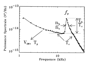Sur ce spectre du bruit thermique, on a porté les différents paramètres physiques qui contrôlent sa forme. Le pic est observé à la fréquence de plasma fp, ce qui fournit la densité totale des électrons. Le spectre thermique est lié à la température des électrons laquelle dépend de la distribution des vitesses des particules électrisées. Dans le milieu interplanétaire la distribution des vitesses des électrons contient deux composantes, une étroite, le coeur, qui contient surtout des électrons relativement lents, et une autre plus large, le halo, qui contient des électrons rapides. La largeur du pic spectral dépend du rapport des densités du halo (nh) et du coeur (nc) ; la hauteur du pic, du rapport des températures du coeur et du halo. Vers les basses fréquences, le spectre dépend de la vitesse du vent solaire ambiant et de la température Tp des protons.