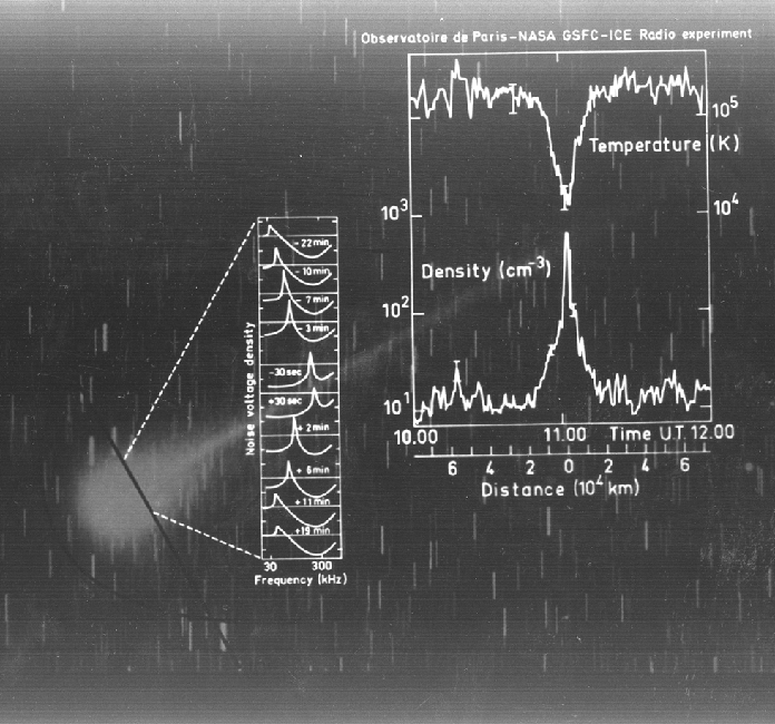 Sur le fond, on voit la comète Giaccobini-Zinner et sa tête en bas à gauche. En travers de la queue, un trait noir représente la trajectoire de ISEE-3. Au milieu de la figure, on voit dix spectres du bruit thermique enregistrés à divers instants, c’est-à-dire en différents points de la queue. D’un spectre à l’autre, on voit la position en fréquence du pic varier : à partir de l’entrée dans la queue (en haut de la figure), fp augmente et le pic se déplace vers la droite. Le processus inverse se produit quand ISEE-3 commence à sortir de la queue (vers le bas de la figure). A droite sont les résultats de l’exploitation de tous ces spectres. La densité au pic atteint des valeurs élevées qui n’ont pu être mesurées par aucun des autres instruments de ISEE-3 parce que trop grandes pour eux.
