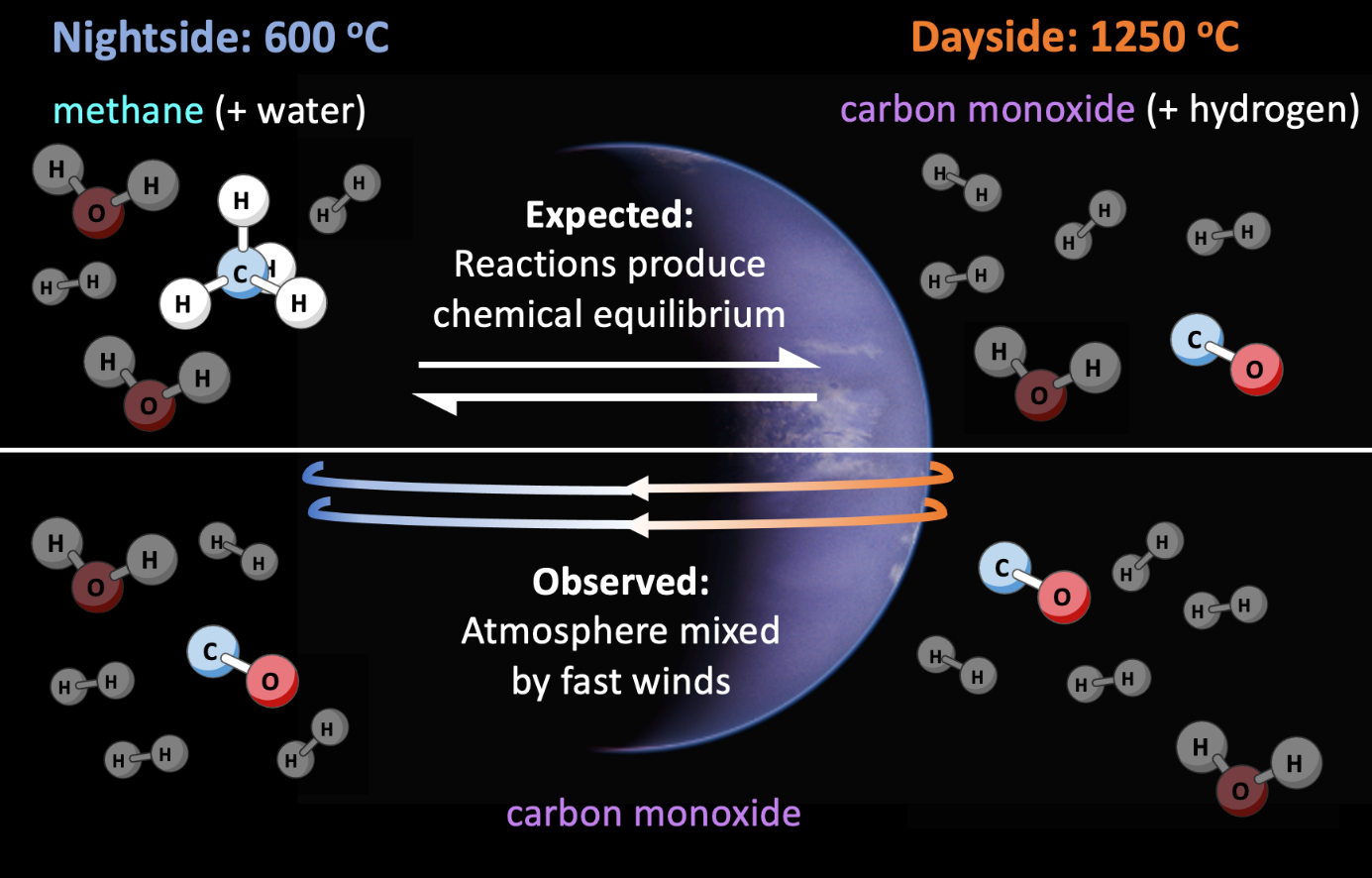 Comme attendu, la vapeur d’eau est présente des deux côtés, contraignant l’épaisseur des nuages et leur altitude dans l’atmosphère. Cependant, l’absence de méthane dans l’atmosphère, surtout du côté nuit, étonne car étant plus frais, il devrait exister. Les chercheurs expliquent cette absence par des vents extrêmement rapides, atteignant au moins 8000 km/h, qui empêchent la formation de méthane du côté nuit à des seuils détectables par le JWST.
