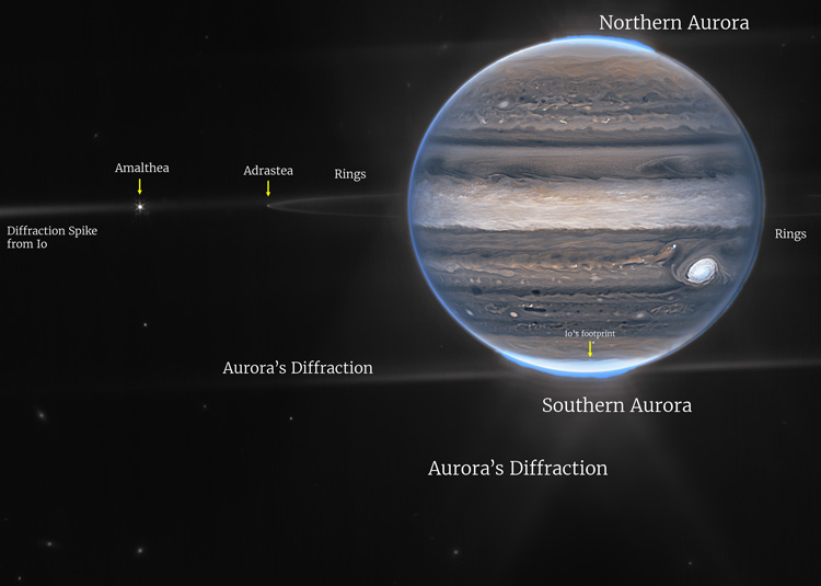 Cette image composite en fausses couleurs de Jupiter a été obtenue avec l’instrument NIRCam à bord du JWST le 27 juillet 2022. Les couleurs sont différentes de la figure car ce mode d’imagerie a utilisé des temps d’exposition différents et seulement 2 filtres, cartographiés en couleurs orange et cyan. L’image montre les anneaux de Jupiter et certains de ses petits satellites ainsi que des galaxies en arrière-plan. Amalthea (250x150 km de diamètre) et le petit Adrastea (20 km de diamètre) sont visibles sur cette image. Le motif de diffraction créé par les structures brillantes comme les zones aurorales ainsi que la lune Io (juste à gauche, non visible sur l’image) forment un arrière-plan complexe de lumière diffusée autour de Jupiter.