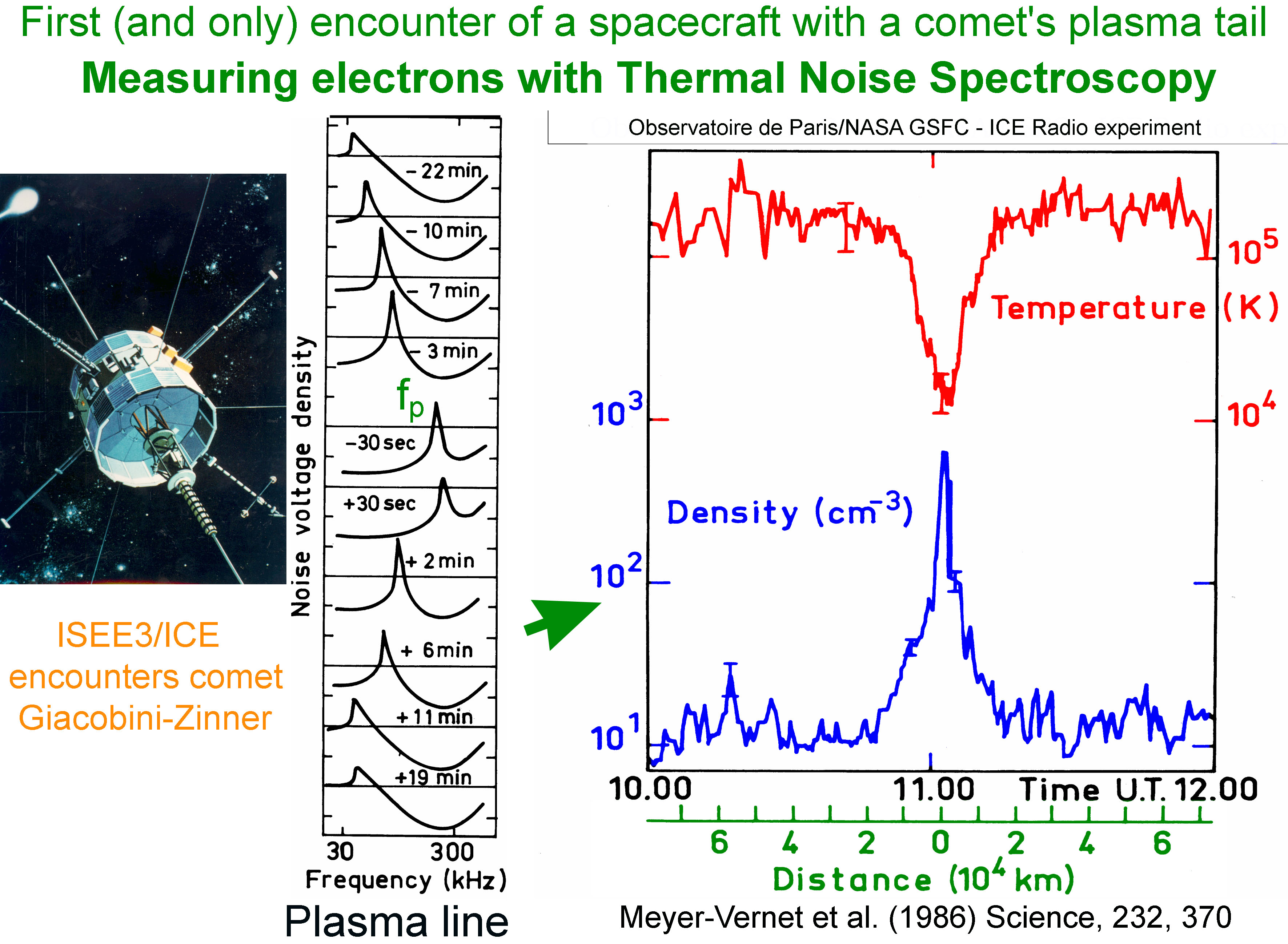 La rencontre avec la comète Giacobini-Zinner a eu lieu le 11 Septembre 1985 avec un passage à 7800km du noyau. Le magnétomètre (Smith et al. 1986) a confirmé le concept de repliement des lignes de champs magnétique proposé par Alfvén (Fig. 1), guidant une queue de plasma froid et dense. L’instrument radio, conçu, testé et fabriqué à l’Observatoire de Meudon (en collaboration avec la NASA/GSFC) était le plus sensible existant à l’époque. Sa qualité exceptionnelle a permis de mesurer la densité et la température des électrons, en utilisant une technique développée à l’Observatoire : la spectroscopie du bruit thermique (Fig. 2).