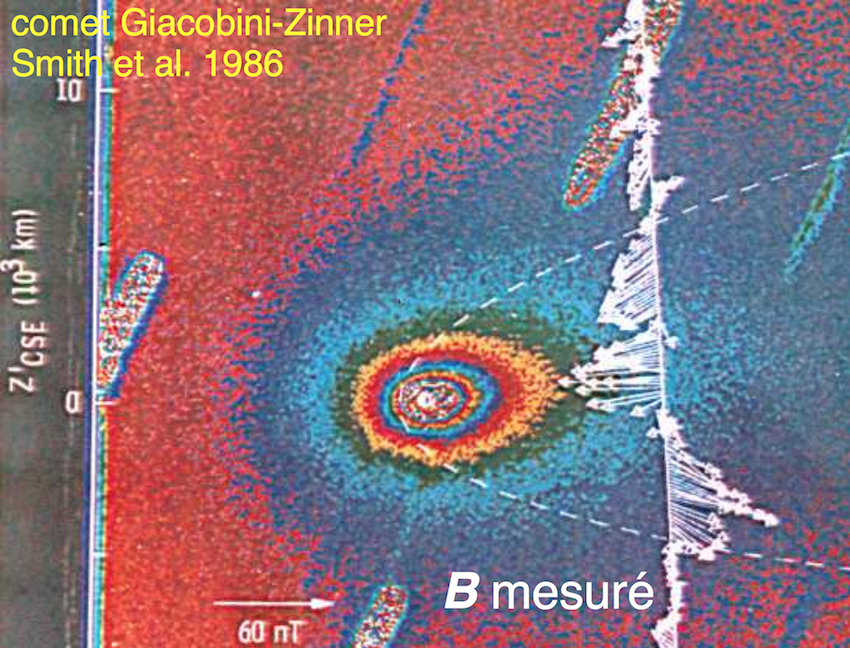 La comète Giacobini-Zinner vue depuis la Terre (CFHT), en fausses couleurs. Le champ magnétique mesuré par la sonde ISEE3/ICE est tracé le long de sa trajectoire, montrant clairement le changement de direction du champ magnétique dans la queue. Crédits : Smith et al. 1986