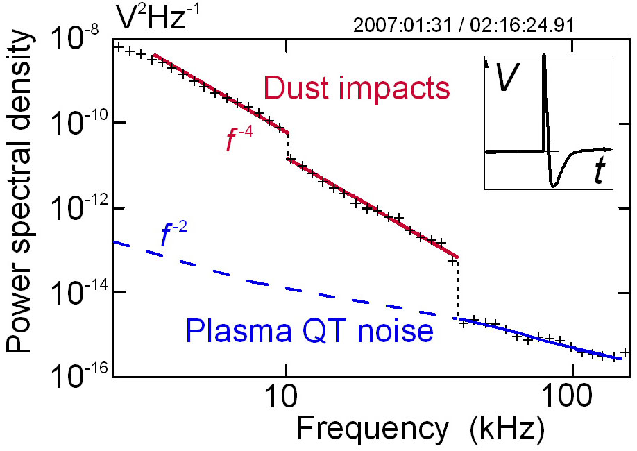 Spectre de puissance mesuré sur plusieurs bandes de fréquence du récepteur S/WAVES, dû aux impacts de nano poussières (en rouge). Le spectre est d’amplitude très supérieure au spectre quasi-thermique du plasma du vent solaire (en bleu, d’après Meyer-Vernet and Perche 1989), et a une forme différente. L’encadré montre la variation de potentiel produite par un impact individuel.